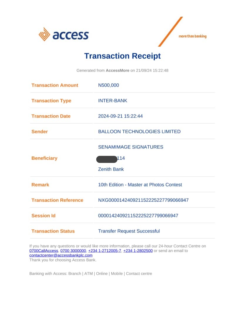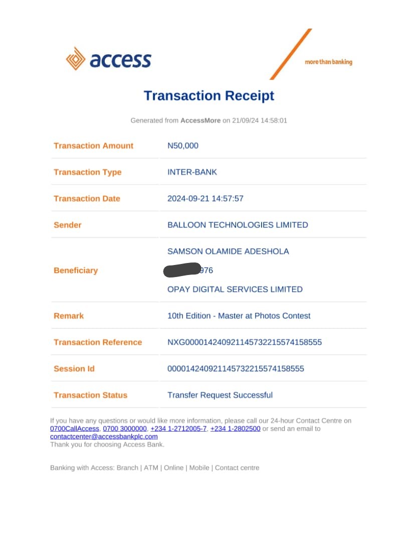 Here is a receipt of the transfer we made to Oluwakemi Ezekiel