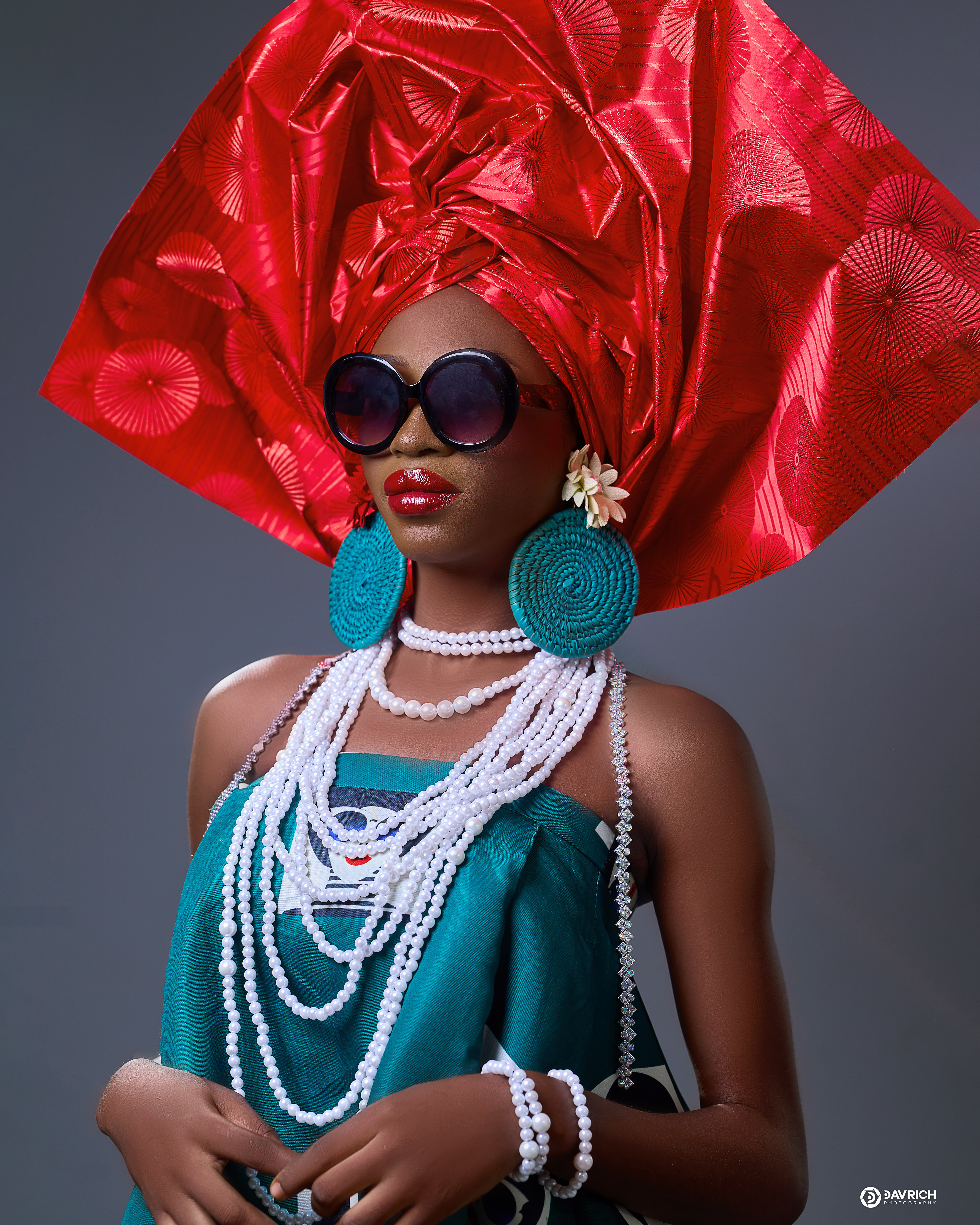 Her outfit, a deep teal traditional wrapper, contrasts beautifully with the red gele, creating a rich visual balance between calmness and confidence. The simplicity of the fabric allows the accessories to shine, turning the composition into a visual symphony of color, culture, and class.