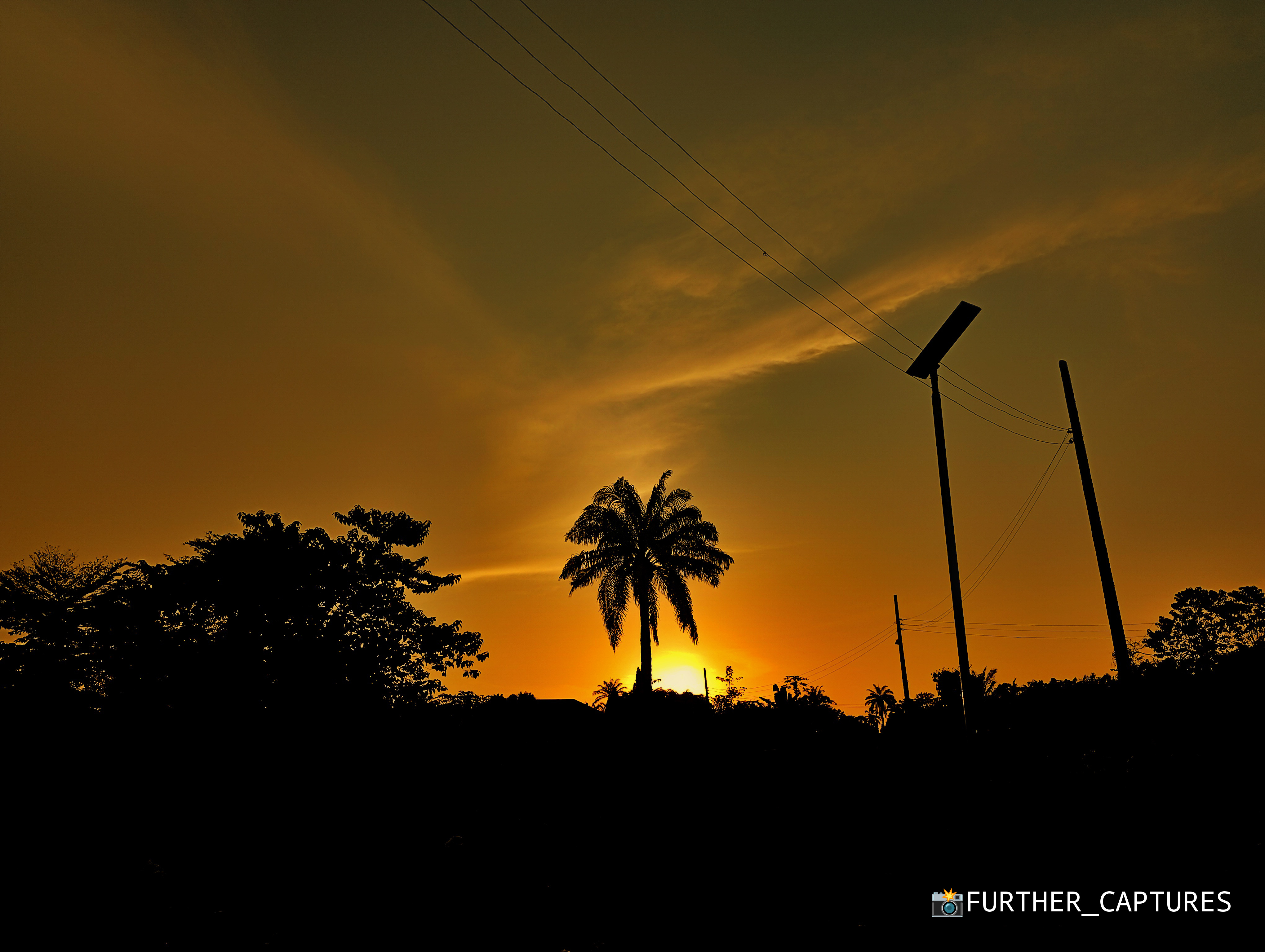The magic in this photo, 'The Golden Curtain,' lies entirely in the lighting. I was fascinated by the way the setting sun was creating such a dramatic, backlit scene. I purposefully composed the shot to leverage the silhouette technique, turning the foreground elements—the trees, the palm, and the poles—into bold, graphic shapes. The intense gradient of the sky, with its striking orange and sepia tones, provides the perfect backdrop, making the edges of the palm tree almost glow. It's a study in shadow and light, showing how darkness can give definition and intensity to one of nature's most spectacular daily performances.