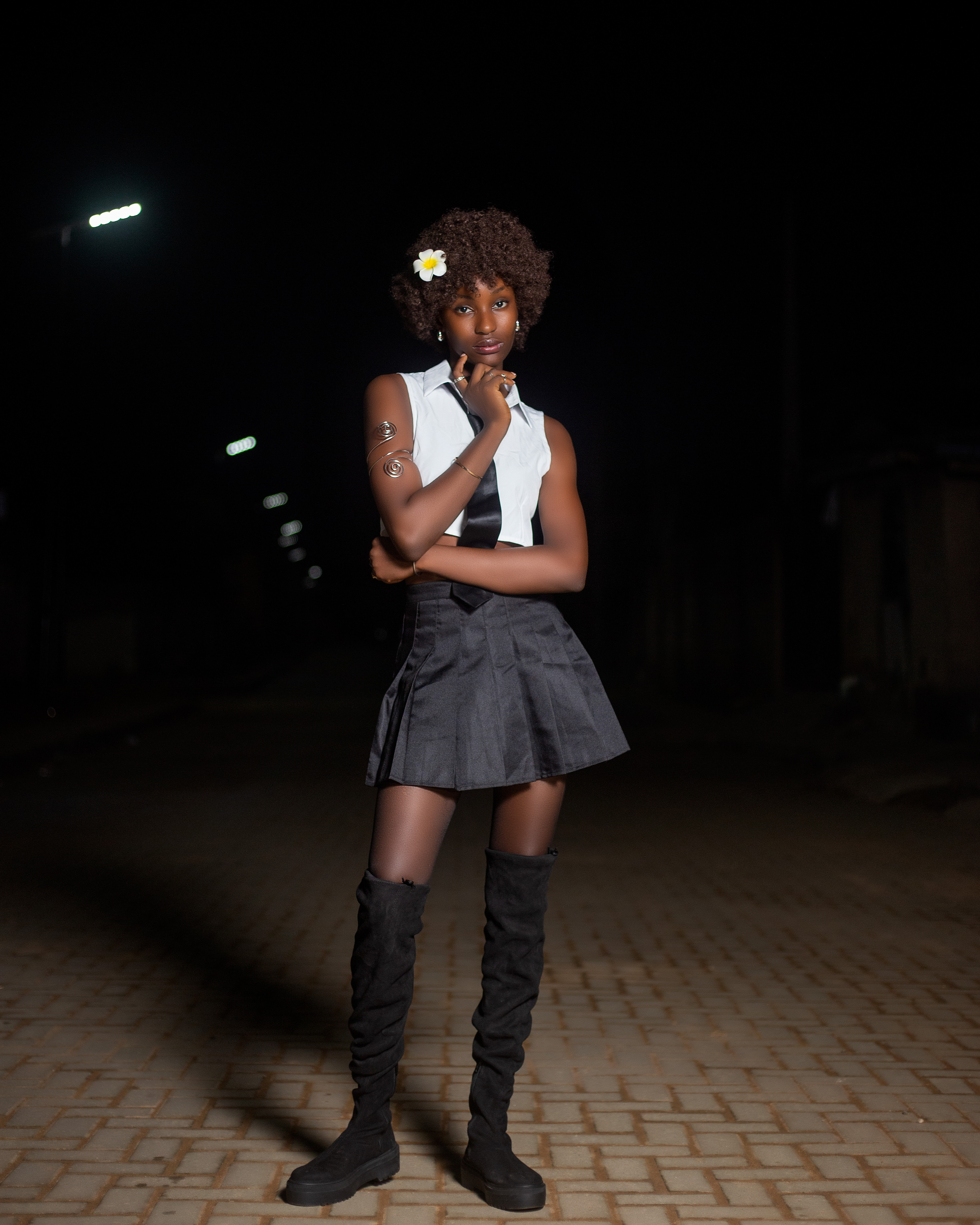 Amid the quiet of the night, she stands as a symbol of confidence and calm a blend of elegance and strength. The dark street behind her represents the unknowns we all face, yet she stands illuminated, fearless, and self-assured.