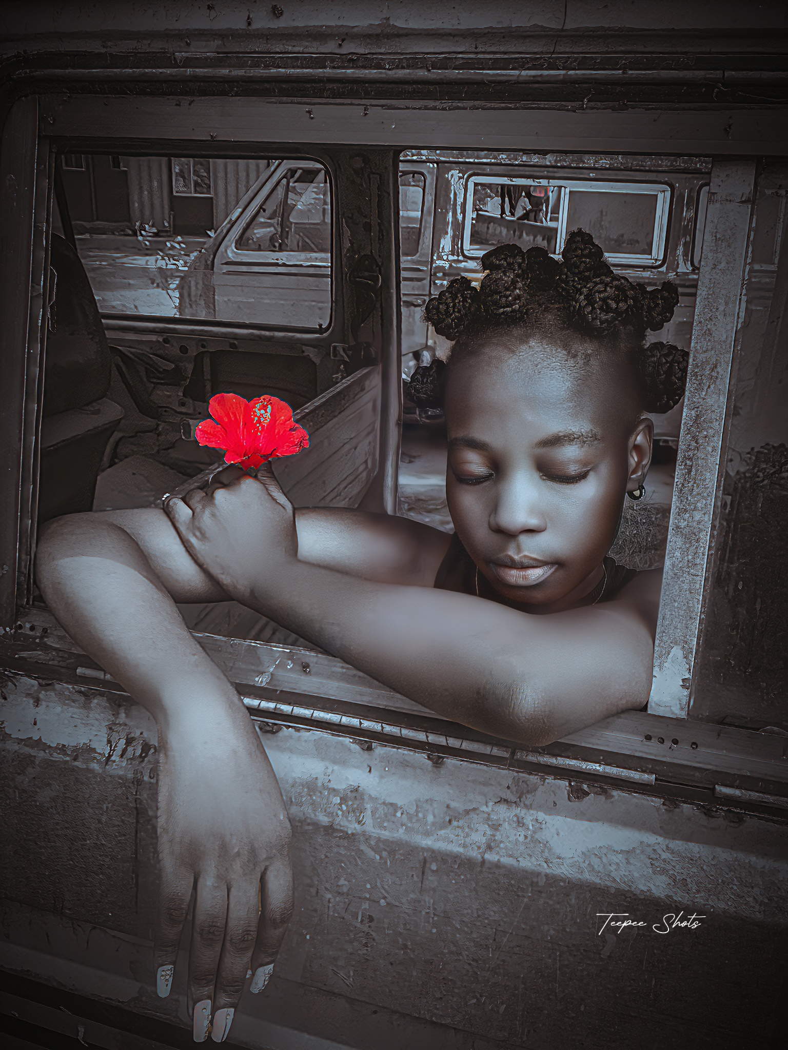 The red flower is the only color that refuses to fade. It represents hope, love, pain, and survival all at once. In a space where everything has been drained of life and vibrancy, something still blooms. Something still chooses to be seen.