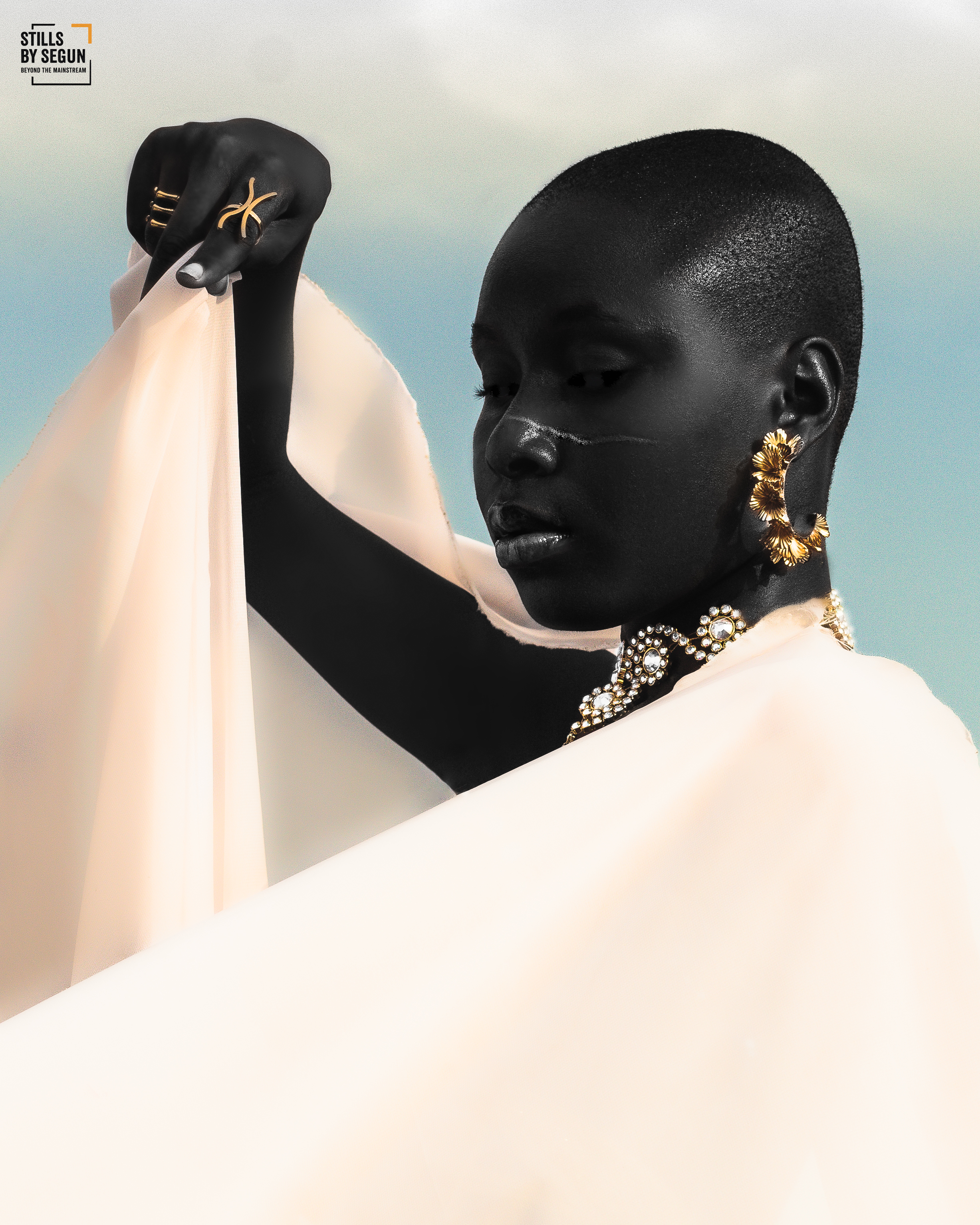 The photo depicts a young native ebony princess in the middle of a courting ritual as she covers her face softly. She is adorned in golden earrings, finger rings and gemstones on her neck.