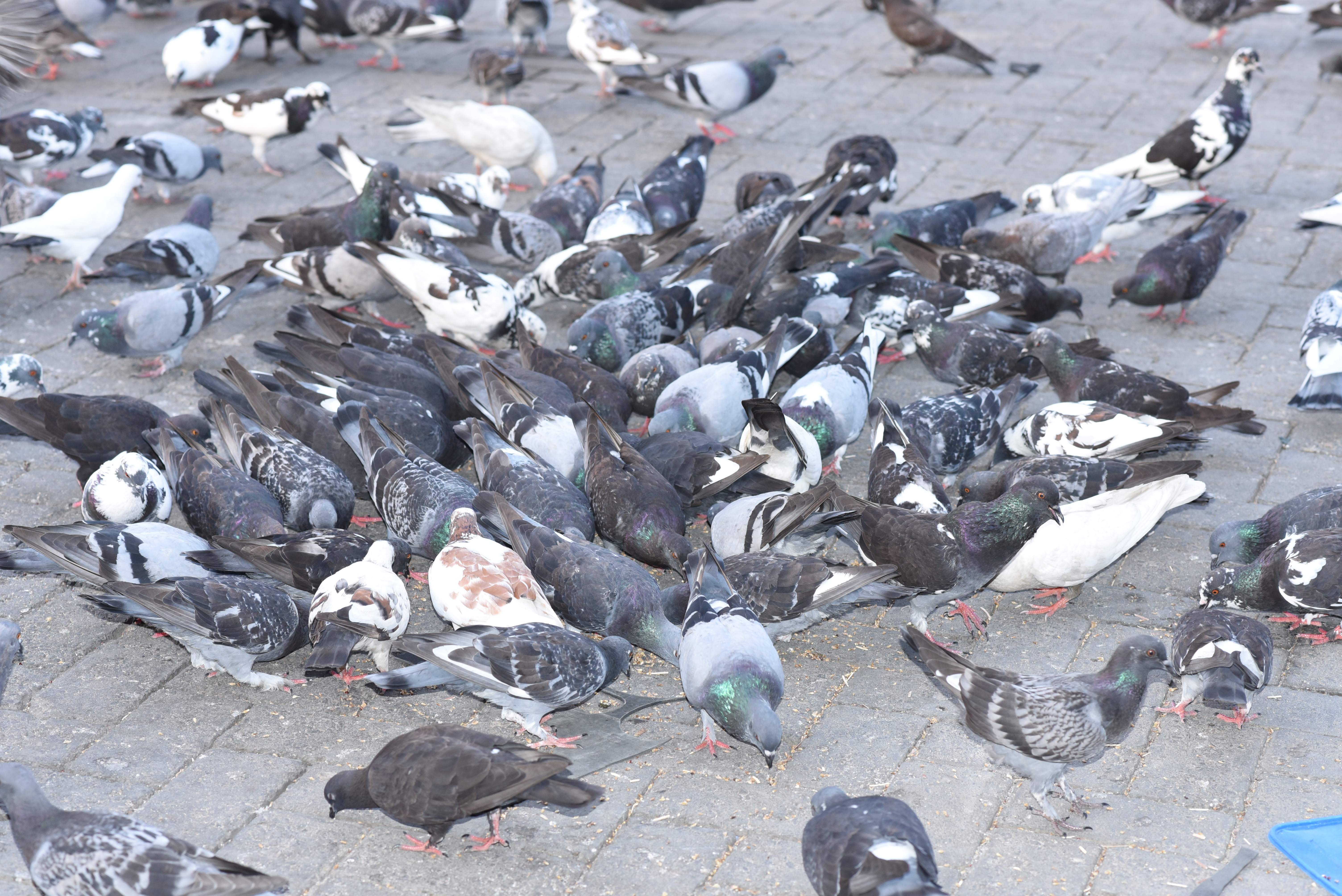 A group of pigeons in their hundreds, having good,communicating with themselves, taking their breakfast in the early hour of the day.