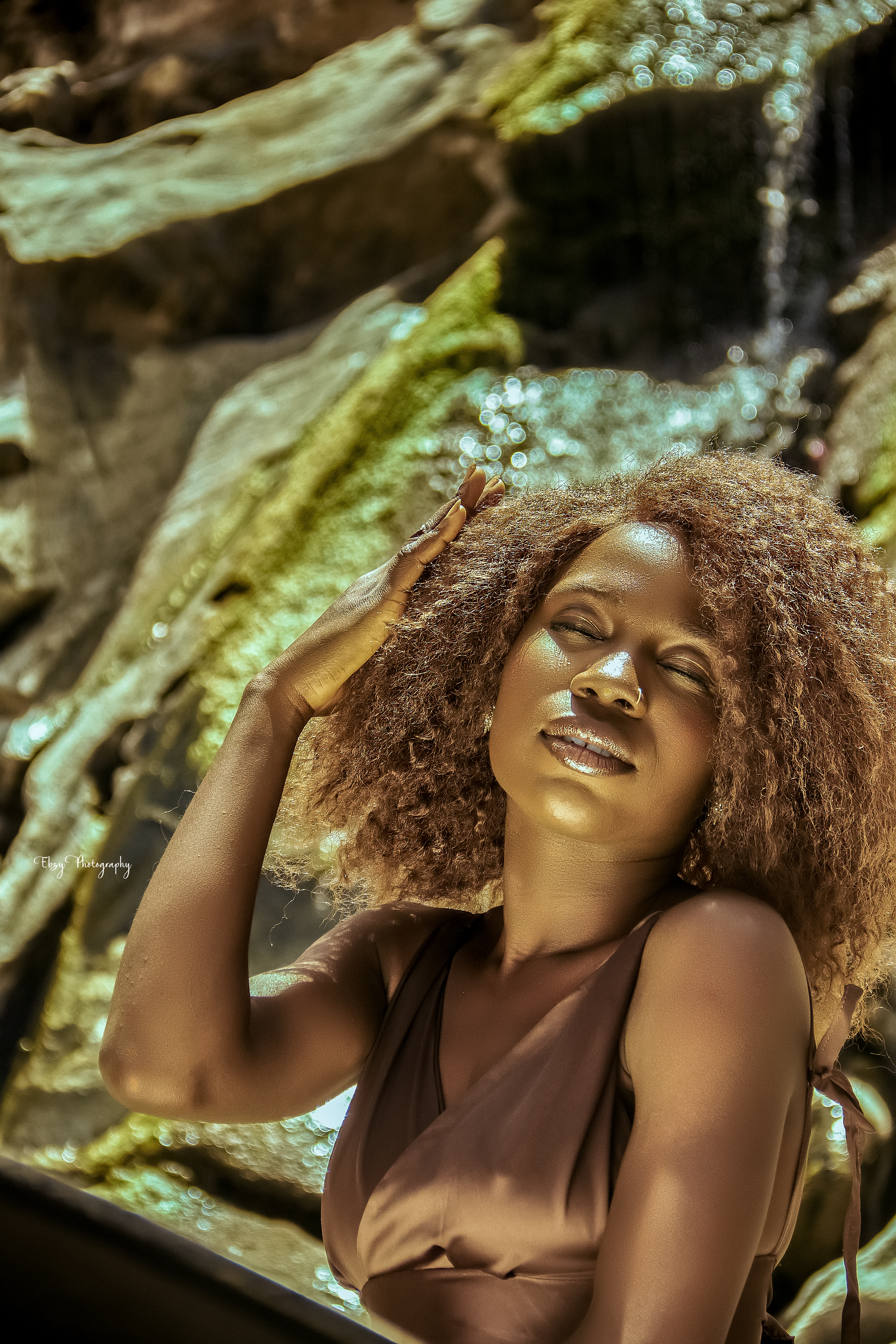 This photo is centered on serene self-empowerment and the intimate connection between a woman and nature. It captures a quiet moment of inner peace, where the subject embraces her natural beauty—particularly her radiant skin and textured afro hair—while immersed in a raw, earthy environment of flowing water, moss-covered rocks, and soft light. The theme explores femininity, self-acceptance, and the restorative power of nature.